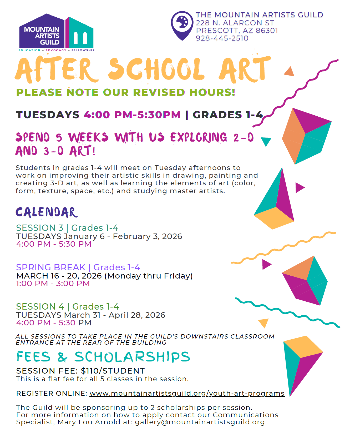 The Mountain Artists Guild’s Youth Art Committee is excited to announce the 5-week sessions we will be offering during the 2025-2026 school year. The Guild has many teachers who want to share their favorite art lessons with children who love creating 2- and 3-dimensional art.